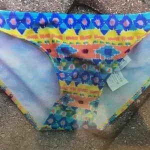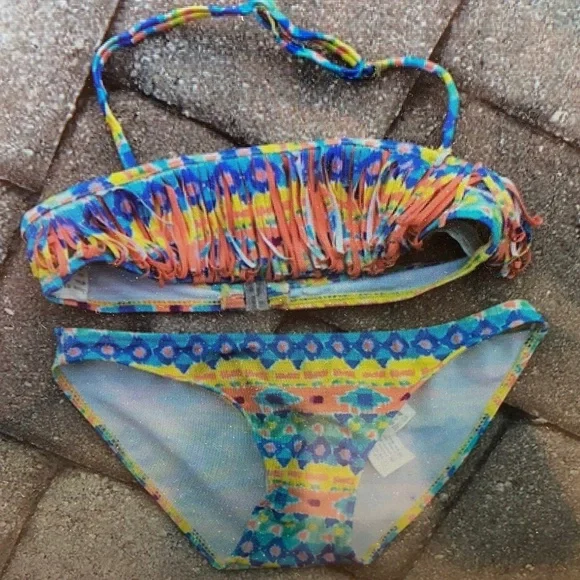 Vibrant bikini set with a colorful pattern. Features a strapless top and matching bottoms.