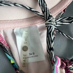 Vibrant bikini set featuring a mix of pink, orange, and black patterns. Perfect for a stylish day at the beach.