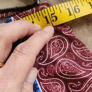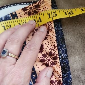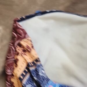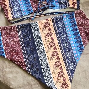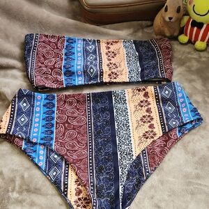 Stylish bikini set with a vibrant pattern. Features shades of blue, brown, and cream. Interior of top has discoloration. I have laundered to no avail. Also, it appears there was a strap or string for top; it is missing