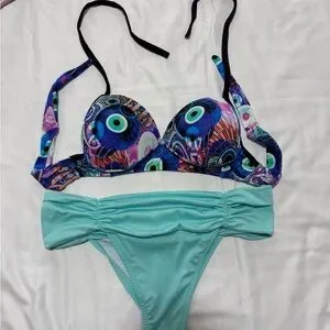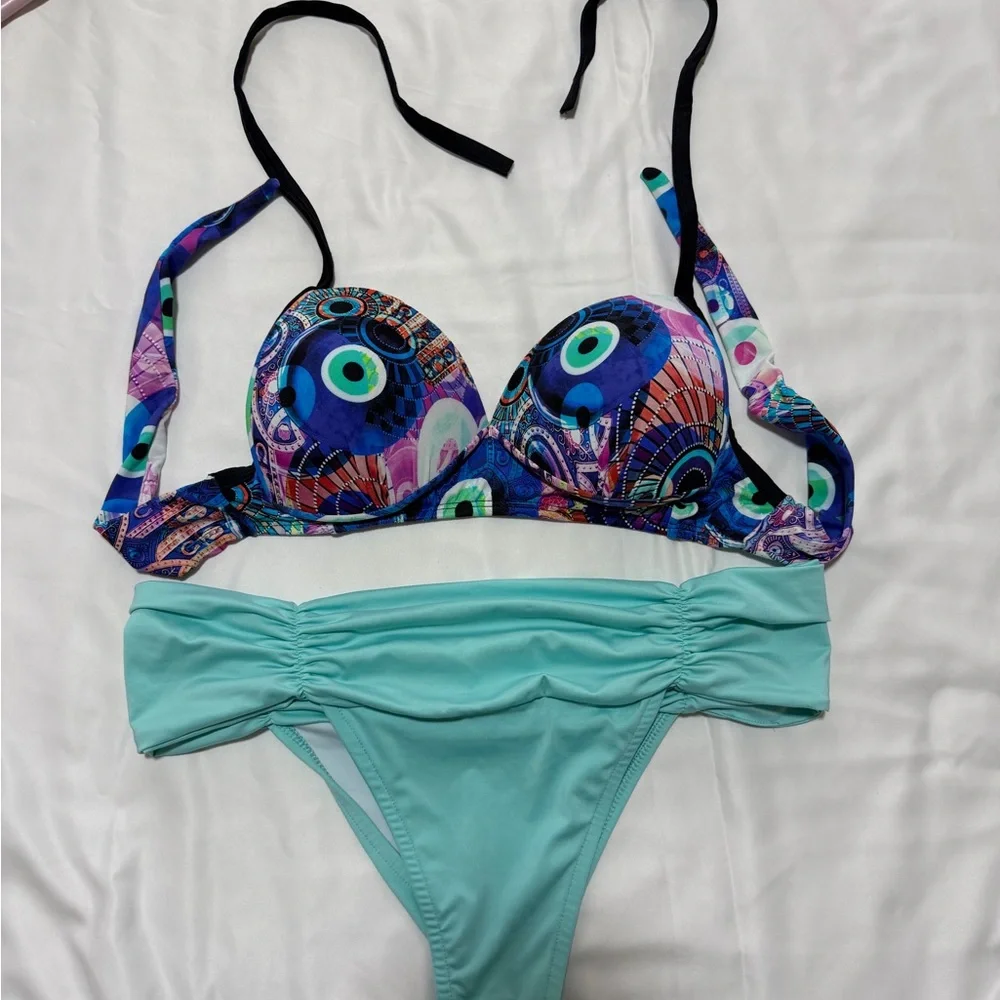 Dive into style with this vibrant bikini set featuring a colorful pattern. Perfect for making a splash at the beach or pool. Beautiful bikini set featuring a vibrant colorful printed top with artistic circular patterns and a mint green bottom with ruched detail.