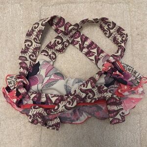 Vibrant bikini top with a mix of patterns. Features shades of pink, cream, and black. Pretty sure it’s an XS but no tag