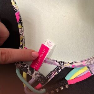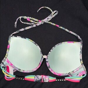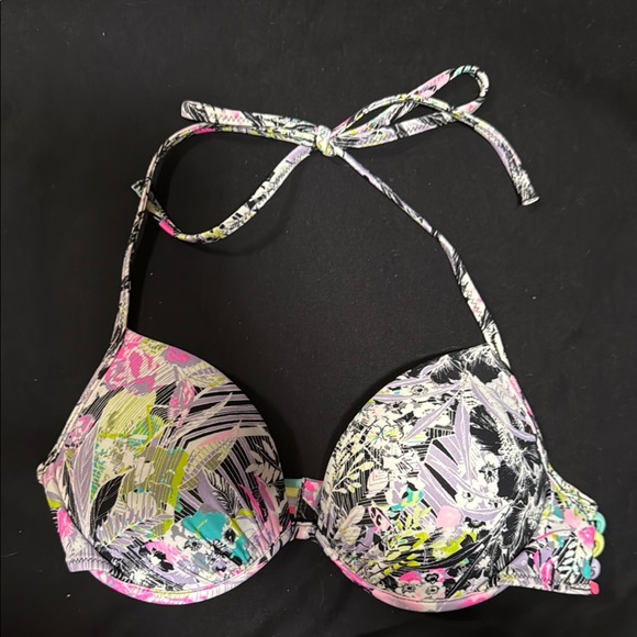Vibrant bikini top with a multicolor abstract pattern. Features adjustable halter straps.