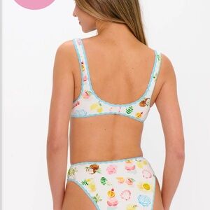 Vibrant bikini top with playful beach themed patterns. Features a mix of bright colors.