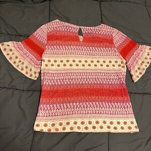 Vibrant blouse with red, pink, and purple patterns. Features flared sleeves and a keyhole back.