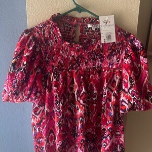 Vibrant blouse with a striking pattern. Features a mix of red, pink, and black colors. Perfect for adding a pop of color to your wardrobe.