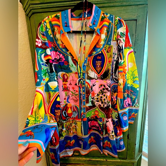 Vibrant blouse with a colorful pattern. Features a mix of blue, orange, pink, and green hues. Never worn.