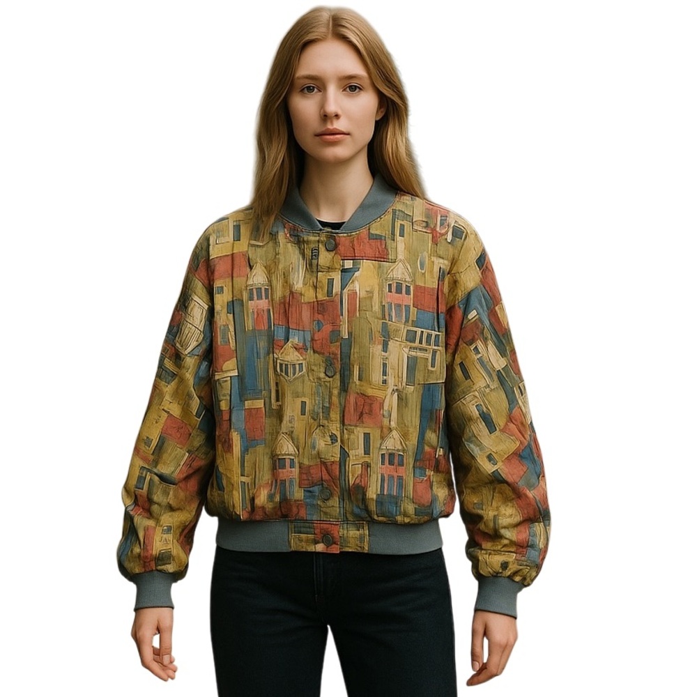 Stand out with this vibrant bomber jacket featuring a unique multicolor pattern. Perfect for adding a pop of color to any outfit.