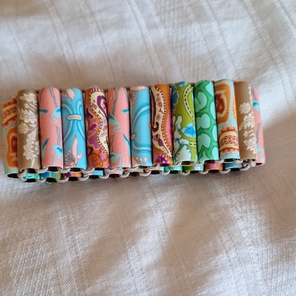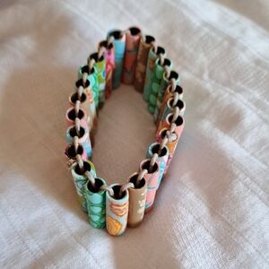 Add a splash of color to your outfit with this vibrant patterned bracelet. Featuring a mix of pink, blue, green, and tan hues, it's perfect for any occasion.