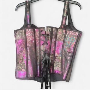 Vibrant bustier top with a mix of pink, purple, and teal patterns. Features structured cups and adjustable straps.