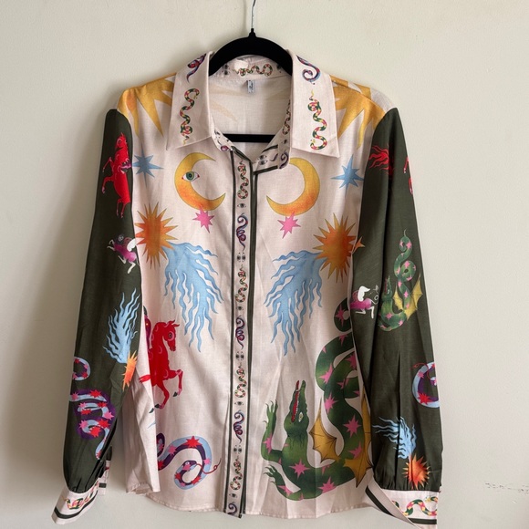 Vibrant button down shirt featuring a unique and colorful pattern. Perfect for adding a bold statement to your wardrobe. Excellent condition
