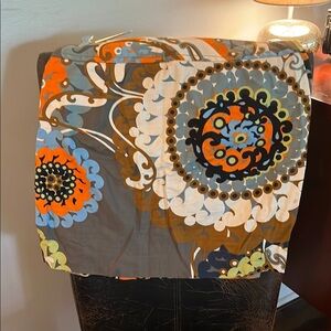 Vibrant skirt with bold patterns and button details. Features orange, blue, and gray colors.