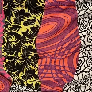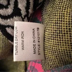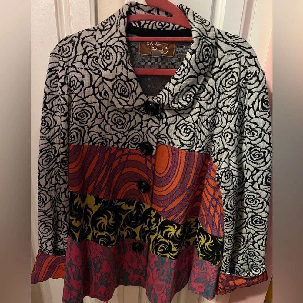 Vibrant jacket with a mix of patterns. Features large buttons and a unique design. Size Large. It’s so cute and the curved collar is too cute.