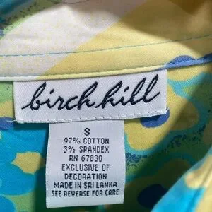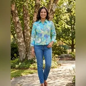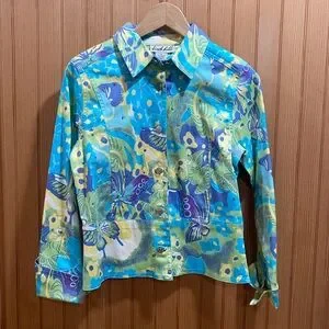 Vibrant button-up shirt with a playful pattern. Features shades of blue, green, and purple.