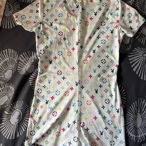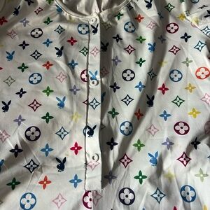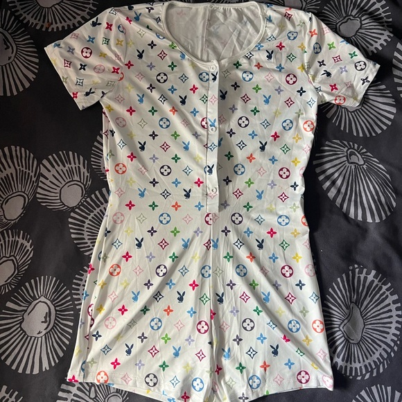 Vibrant romper with a colorful pattern. Can be used as sleepwear. Features a button-up front. Never worn