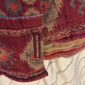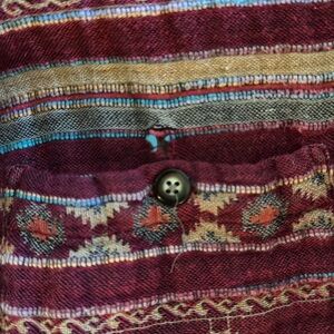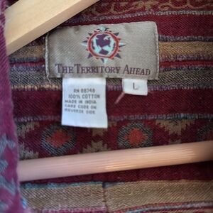 Vibrant button-up shirt with a colorful pattern. Features a mix of red, pink, and orange hues. Perfect for adding a pop of color to any outfit. Has some tears but nothing making the garment useless no tears go all the way through the shirt.