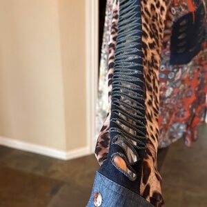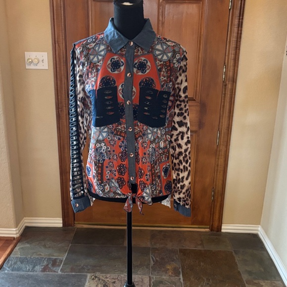 Vibrant button-up shirt by John Mark with a mix of patterns & tie front. Features orange, blue, and animal print accents. Stylish and unique design. Size S. NWOT