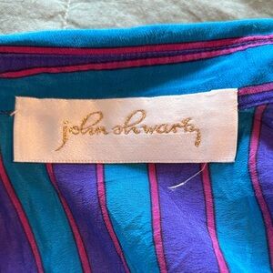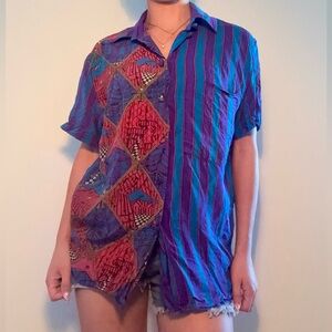 Vibrant button-up shirt with a mix of patterns. Features bold blue and red colors.