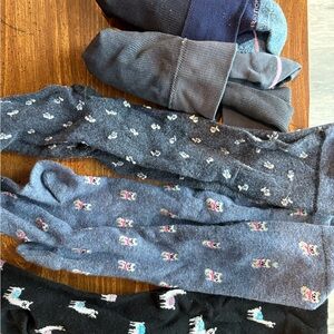 Set of colorful patterned socks featuring playful designs. Includes shades of blue, gray, and black. Women shoe size 7.5