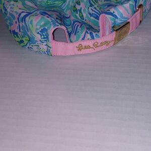 lilly Vibrant cap with a colorful pattern. Features coral shell pattern with shades of blue, green, and pink. gold tone slide on back to adjust size