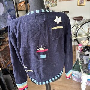 Vibrant cardigan with playful patterns. Features a mix of colors including blue, red, and yellow. Perfect for a preschool teacher or smth. Estimating size small