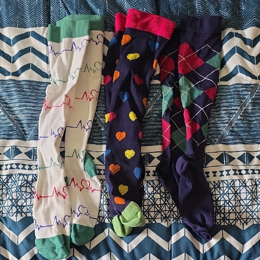 Set of three colorful patterned socks. Includes heartbeats, hearts, and argyle designs. Perfect for adding compression to any outfit.
