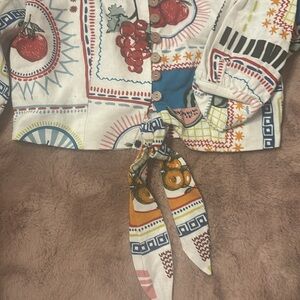 Vibrant crop top with a playful pattern. Features a tie front and long sleeves. Perfect for a bold look.