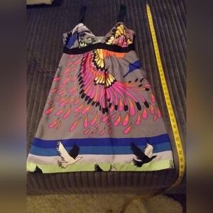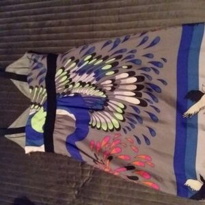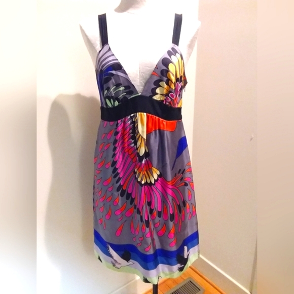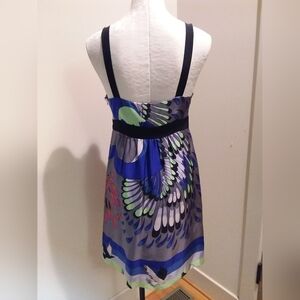 This silk Tibi dress is a stuning display of color and crafmanship, designed with a modern and feminine sensibility with a delicate side zipper. The fabric is rich with vibrant hues, creating a lively yet sophisticated palette. The dress combines contemporary style with luxurious fabric, making it perfect for a day or evening event. The best part it that it doesn't wrinkle, making it perfect for travel.