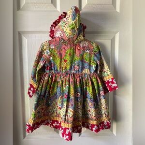 Vibrant dress with a playful pattern. Features a mix of red, green, blue, and yellow colors.