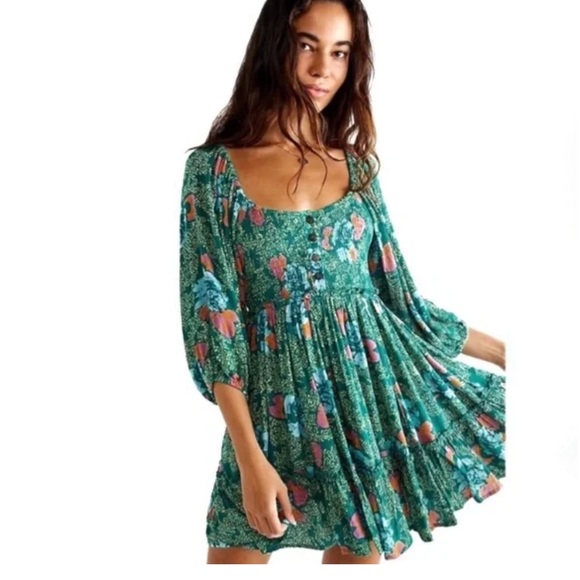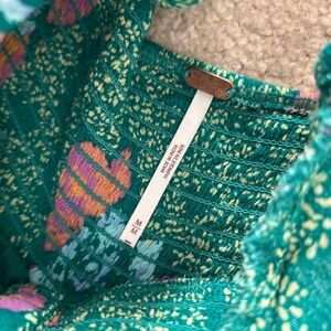 Vibrant dress with a colorful pattern. Features shades of green, purple, and blue.