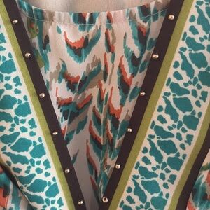 Vibrant dress with a multicolor pattern. Features green, orange, and cream hues.