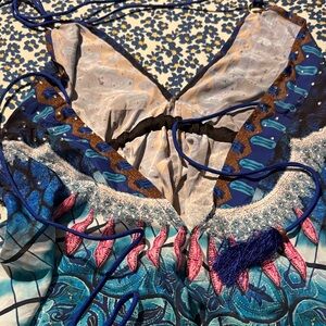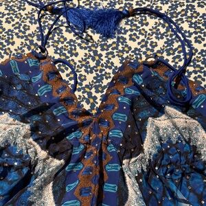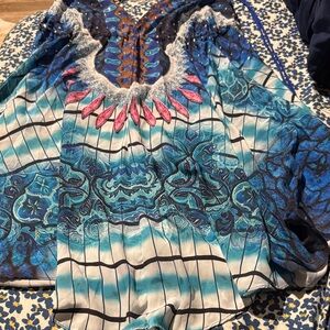 Vibrant dress with intricate patterns. Features shades of blue, pink, and brown.