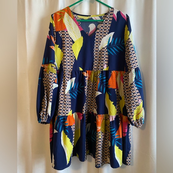 Vibrant dress with a bold pattern. Features blue, yellow, orange, and pink colors.