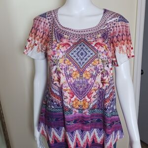 Vibrant dress with intricate patterns. Features shades of purple, pink, and orange.