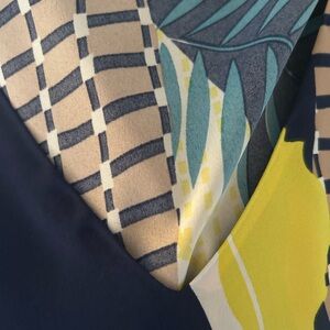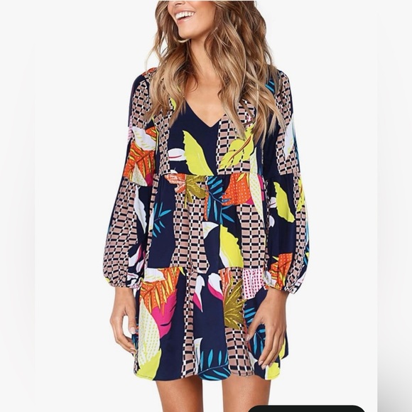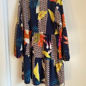 Vibrant dress with geometric and floral patterns. Features a mix of blue, yellow, pink, and green colors.