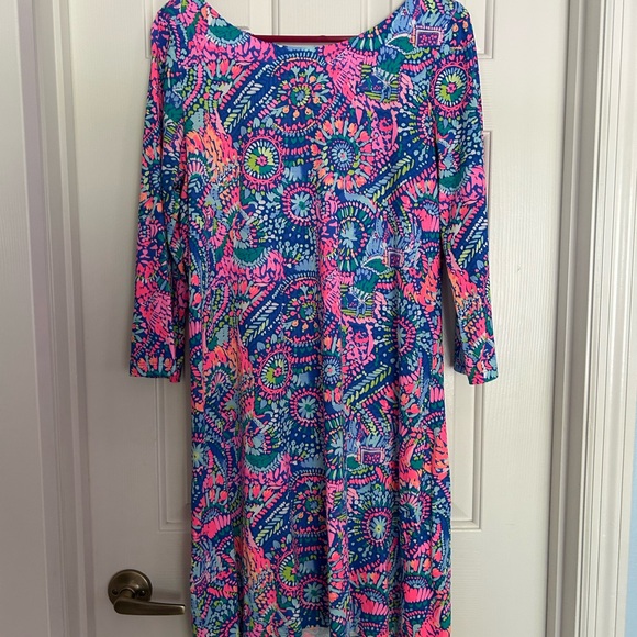 Vibrant dress with a colorful pattern. Features a mix of blue, pink, and green hues. Perfect for a lively look.