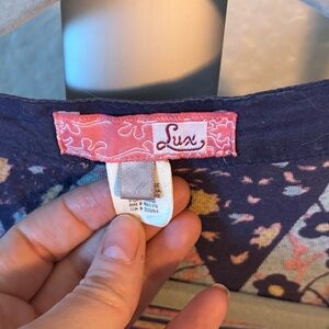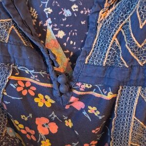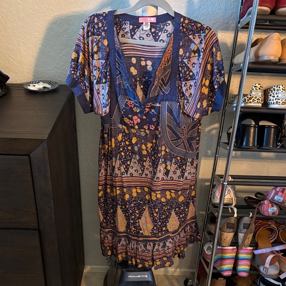 Vibrant dress with a mix of blue, orange, and pink patterns. Short sleeves and a flowing design. Originally from urban outfitters