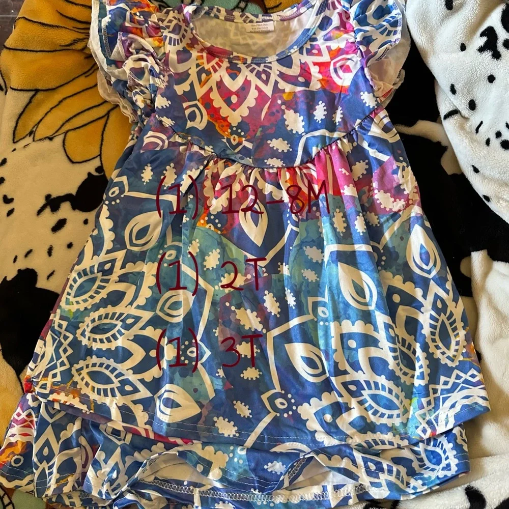 Vibrant dress with a multicolor pattern. Features shades of blue, pink, and purple.
