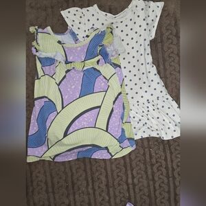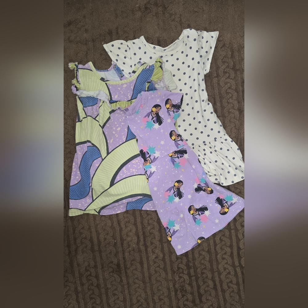 Set of colorful dresses with unique patterns. Includes polka dots and character prints.