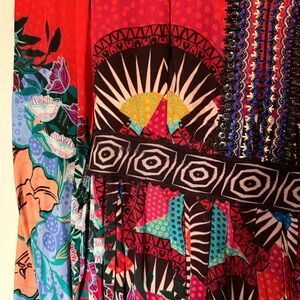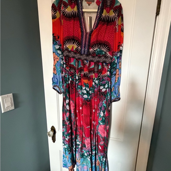 Vibrant and stylish, this maxi dress features a stunning mix of colors and patterns. Perfect for making a statement at any event. Embellished and embroidered with an amazing pattern. Perfect for traveling! Labelled a 4 but fits more like a size 2. Between an xs and a small.