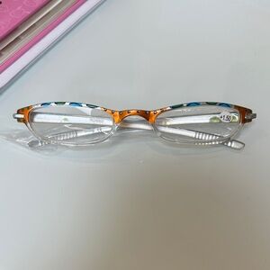 Stylish eyeglasses with a vibrant orange and blue pattern. Clear lenses and frame. Brand new with tags +1.5 reader