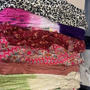 A vibrant collection of fabrics featuring floral, animal print, and abstract designs. Includes shades of red, pink, purple, and green. All 6 dresses for one price, packaged pretty with freebies all in one box! Think stitch fix on a budget. All dresses run L and are about the same size, 2 say “one size” The leopard is and Xxl and the rest ate L/XL, all are flowy and comfortable
