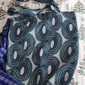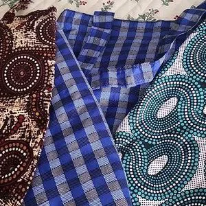 Set of vibrant patterned fabrics. Includes brown, blue, and teal designs. Perfect for crafting or sewing projects.