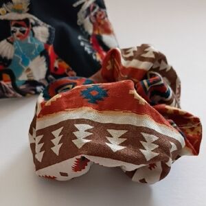 Set of two vibrant headbands with unique patterns. One features a mix of black and colorful designs, the other has earthy tones with geometric patterns.