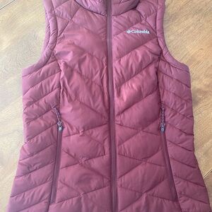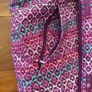 Columbia Girls’ warm winter puffer jacket with a geometric pattern. Features a hood, snow skirt and front zipper pockets.