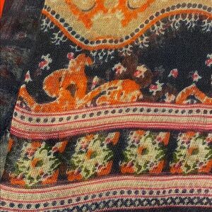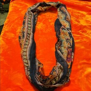 Vibrant scarf with intricate patterns. Features shades of orange, blue and green. Just have too many.