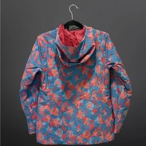Vibrant jacket with a unique red and blue pattern. Perfect for adding a pop of color to your outfit.