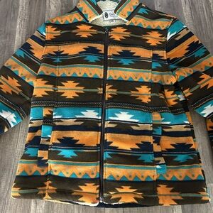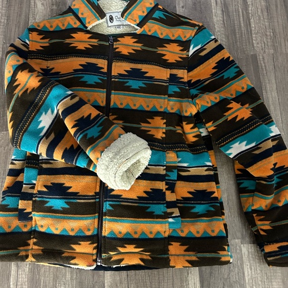 Vibrant jacket with a striking pattern. Features orange, teal, and brown colors. Perfect for adding a pop of color to your outfit.