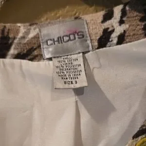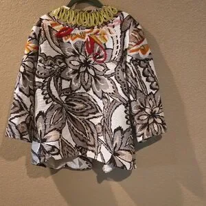 Vibrant jacket with intricate patterns. Features shades of black,red, white, brown, and orange. hook and eye front closure.