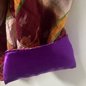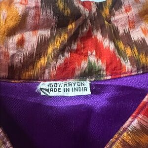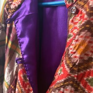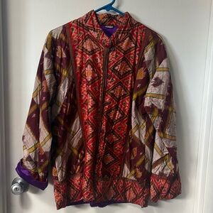 Vibrant jacket with intricate patterns. Features shades of red, purple, and tan. Perfect for a bold look.