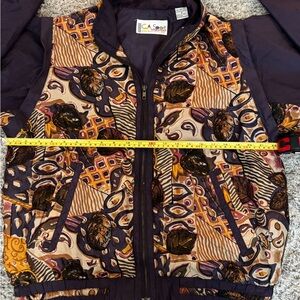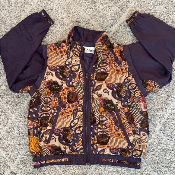 Vibrant vintage jacket with a unique pattern. 100% silk exterior and 100% nylon interior. Features shades of purple, orange, and brown.